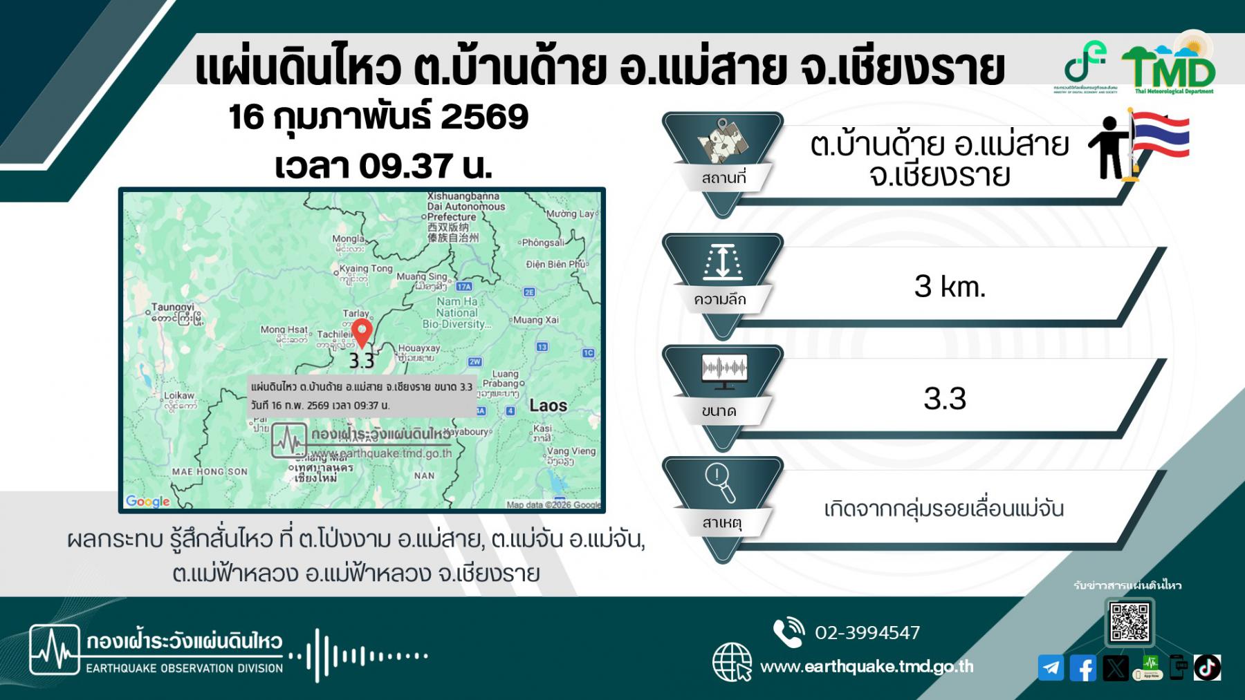 3.3 | 20.304°N | 99.957°E | 3 | ต.บ้านด้าย อ.แม่สาย จ.เชียงราย Tambon Ban Dai, Amphoe MaeSai, ChiangRai |