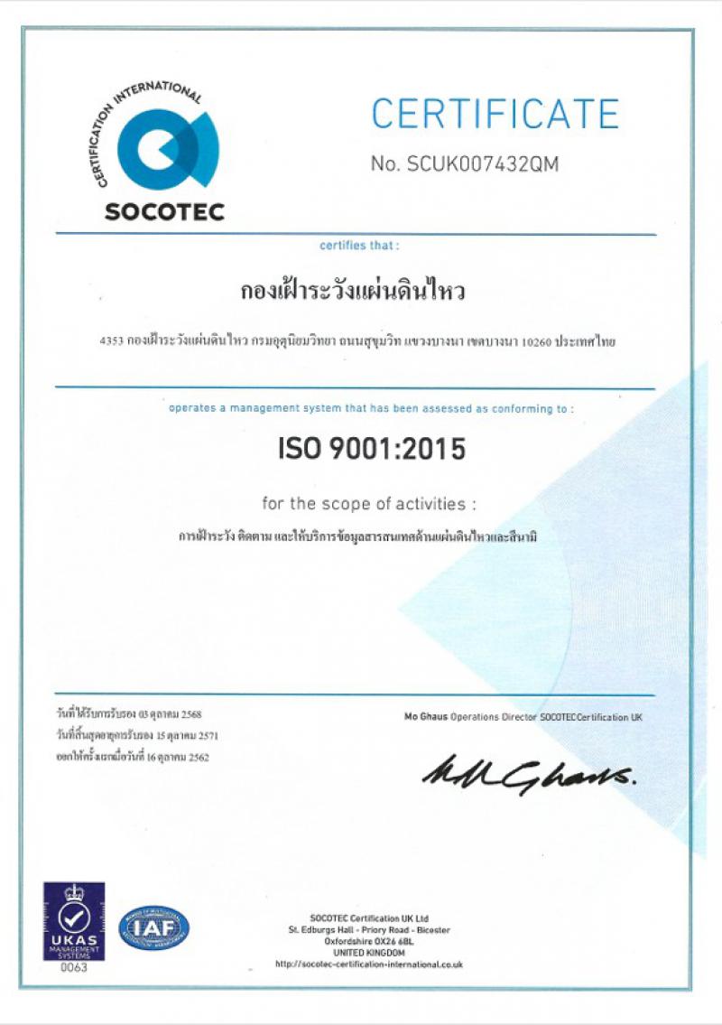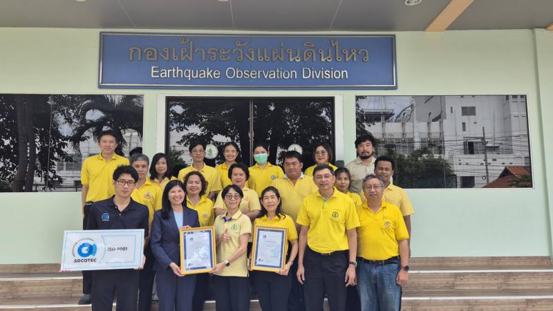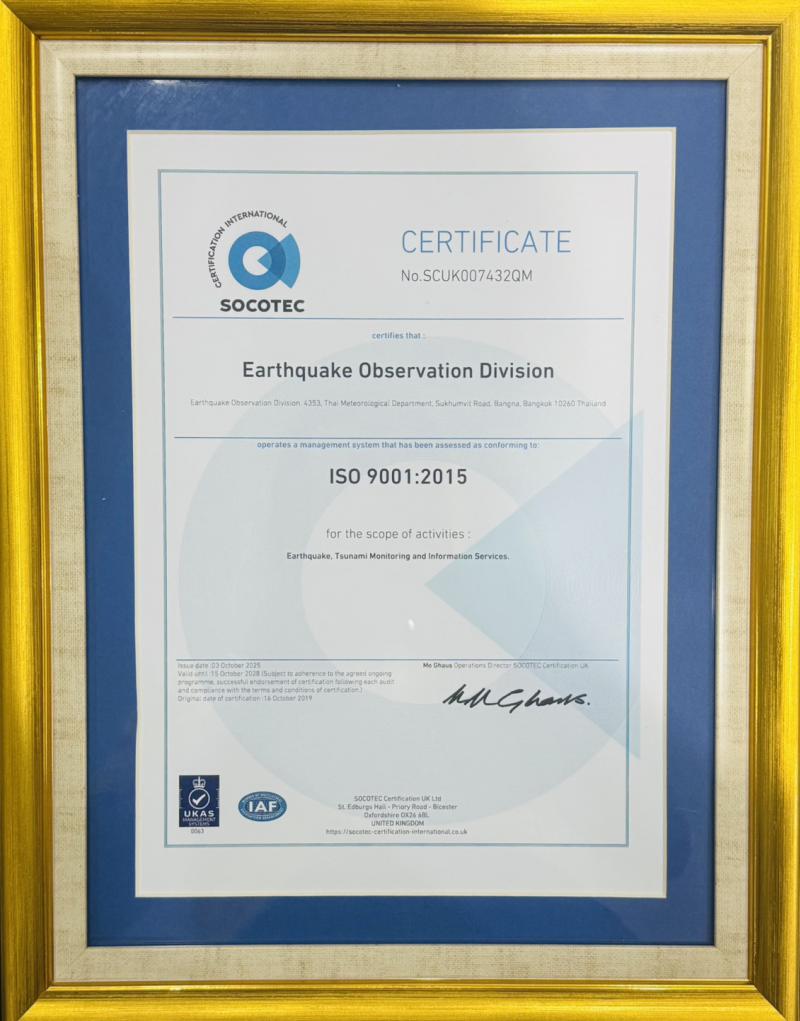 กองเฝ้าระวังแผ่นดินไหว ได้ผ่านกระบวนการ Re-Certification ISO 9001 ก้าวเข้าสู่ปีที่ 7 ของการรับรองมาตรฐาน ทั้งนี้ กองเฝ้าระวังแผ่นดินไหวยังคงรักษาและพัฒนาการบริหารงานคุณภาพด้านแผ่นดินไหวและสึนามิอย่างต่อเนื่อง เพื่อสะท้อนให้เห็นถึงความมุ่งมั่น ในการพัฒนาคุณภาพการทำงาน การเผยแพร่ข้อมูลแผ่นดินไหวเป็นไปอย่างถูกต้อง และมีประสิทธิภาพตามมาตรฐานสากล กองเฝ้าระวังแผ่นดินไหว