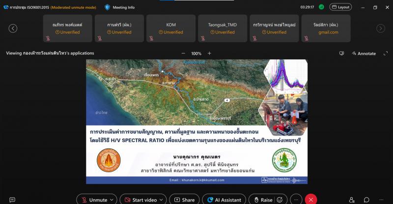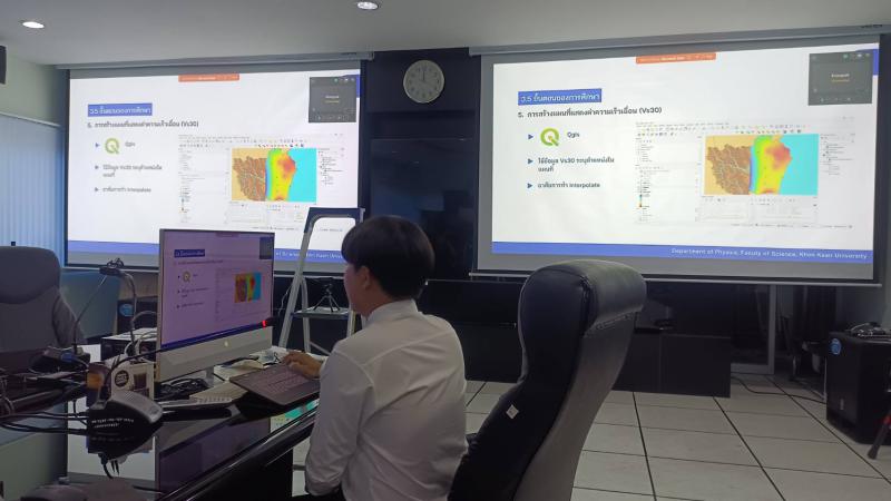 เมื่อวันที่ 19 มีนาคม 2569 กองเฝ้าระวังแผ่นดินไหวเข้าร่วมฟังการนำเสนอโครงงานสหกิจศึกษาของนักศึกษาฝึกงานสาขาวิชาฟิสิกส์ คณะวิทยาศาสตร์ มหาวิทยาลัยขอนแก่น หัวข้อ ‘การประเมินค่าการขยายสัญญาณ, ความถี่มูลฐาน และความหนาของขั้นตะกอน โดยใช้วิธี H/V SPECTRAL RATIO เพื่อแบ่งเขตความรุนแรงของแผ่นดินไหวใบบริเวณแอ่งเพชรบุรี’